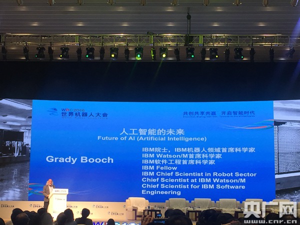 央廣網(wǎng)科技10月21日 10月21日,2016世界機器人大會進(jìn)入論壇時間,共3天主論壇與22場專題論壇。邀請了全球近300位機器人領(lǐng)域知名專家及企業(yè)領(lǐng)袖,就機器人前沿科學(xué)研究、技術(shù)發(fā)展路線及戰(zhàn)略政策制定等問題開展高水平的學(xué)術(shù)交流和探討。IBM院士、IBM機器人領(lǐng)域首席科學(xué)家、IBM Watson/M首席科學(xué)家、IBM軟件工程首席科學(xué)家Grady Booch演講的主題是“人工智能的未來”。