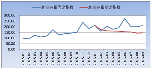 一、電商物流行業(yè)仍處于高速增長(zhǎng)階段。從同比看,2016年總業(yè)務(wù)量連續(xù)9個(gè)月保持在40%以上增速,9月份總業(yè)務(wù)量同比指數(shù)為146.3點(diǎn),比上半年各月有所回落,但仍然保持在140點(diǎn)以上的高位水平。從定比看,以2015年1月份為基期100點(diǎn),2015-2016年總業(yè)務(wù)量定比指數(shù)呈高速增長(zhǎng)態(tài)勢(shì),2016年9月份達(dá)到211點(diǎn),與2015年1月基期相比實(shí)現(xiàn)翻番。指數(shù)反映出,電子商務(wù)的日趨繁榮和網(wǎng)絡(luò)購(gòu)物不斷興起,使我國(guó)電商物流迎來(lái)了前所未有的發(fā)展機(jī)遇,行業(yè)發(fā)展仍將保持較高增速,這一發(fā)展特點(diǎn)既與當(dāng)前我國(guó)消費(fèi)引領(lǐng)的經(jīng)濟(jì)轉(zhuǎn)型升級(jí)密切相關(guān),也得益于行業(yè)自身服務(wù)能力不斷增強(qiáng)。