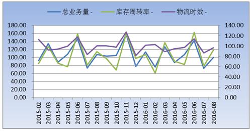 圖表2 總業(yè)務(wù)量指數(shù)、庫(kù)存周轉(zhuǎn)率指數(shù)、物流時(shí)效指數(shù)變化情況