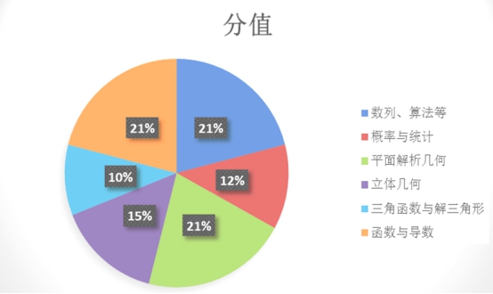 代數(shù)、解析幾何和函數(shù)導(dǎo)數(shù)部分占分相等,比率最高