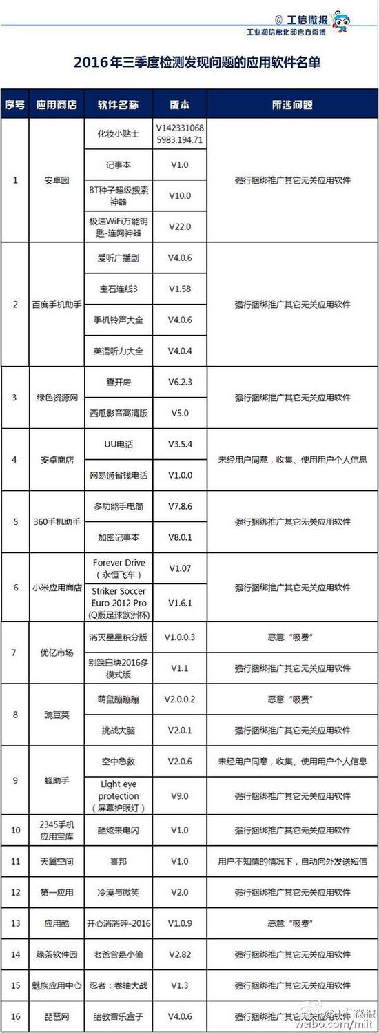 據(jù)工業(yè)和信息化部信息中心官方微博發(fā)布的消息,今年三季度,工信部對50家手機(jī)應(yīng)用商店的應(yīng)用軟件進(jìn)行技術(shù)檢測,發(fā)現(xiàn)違規(guī)軟件29款,涉及違規(guī)收集使用用戶個人信息、惡意“吸費(fèi)”、強(qiáng)行捆綁推廣其他無關(guān)應(yīng)用軟件等問題。小伙伴們快對照下面黑名單,如安裝速卸載。