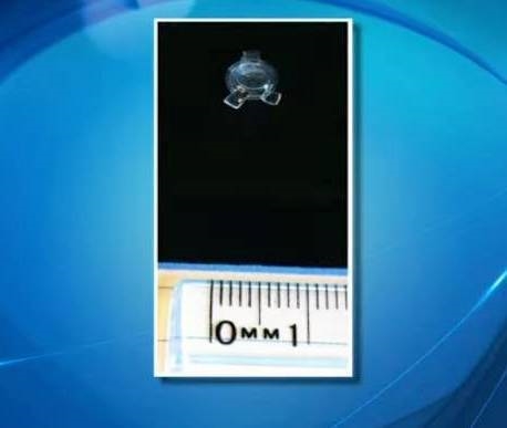 千萬不要以為這個又是一種新的隱形眼鏡,不是的。它由惰性親生物材料制成,不會遭到人體排斥,也不會變質損耗,可終身矯正視力,只要把這個小片片放到你的眼睛里,再用生理鹽水沖洗,10秒后,這個仿生晶體就會擴散到你的整個眼球。