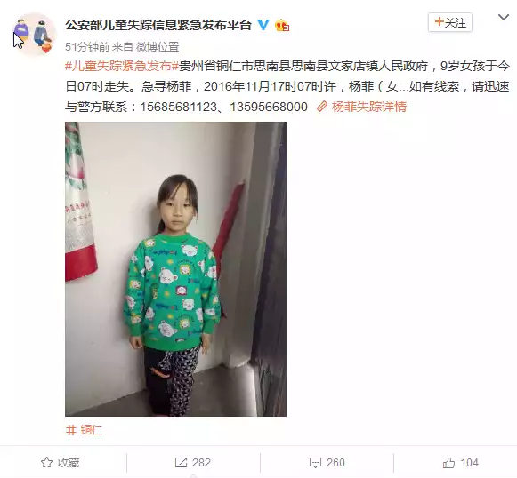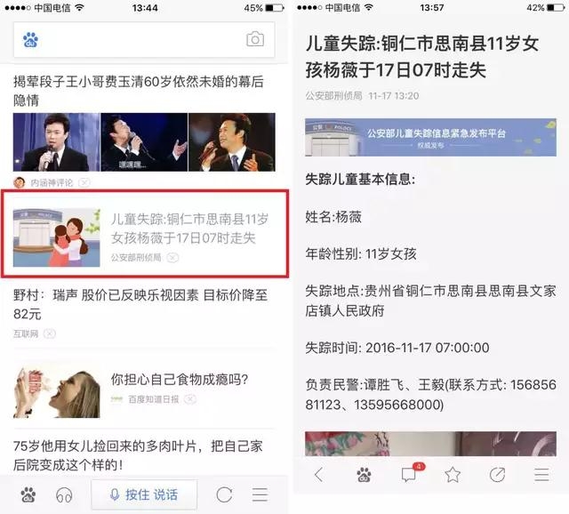 今天下午13時50分,一位重慶用戶在手機百度APP的資訊流里看到一條來自“公安部刑偵局”發(fā)布的消息:“兒童失蹤:銅仁市思南縣11歲女孩楊薇于17日07時走失”,點開信息后可以進一步看到女孩楊薇具體失蹤地點、失蹤時間和負責該案的當?shù)孛窬捌渎?lián)系方式。