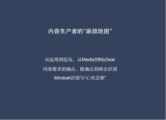 內(nèi)容生產(chǎn)者本身有很多的痛點(diǎn)。我們經(jīng)常說(shuō)痛點(diǎn):打個(gè)比方,在百度地圖上,北京只是一個(gè)點(diǎn),但你把地圖放大的時(shí)候,會(huì)發(fā)現(xiàn)北京不是一個(gè)點(diǎn),他有各式各樣小的更小的、更小的,也許是更重要的一些點(diǎn),你逐漸放大的時(shí)候會(huì)發(fā)現(xiàn)這個(gè)城市各式各樣的信息。所以我們僅僅說(shuō)痛點(diǎn)往往是一個(gè)很粗略的說(shuō)法,我們要從一個(gè)痛點(diǎn)出發(fā),把地圖上的一個(gè)點(diǎn)變成一張?jiān)攲?shí)的地圖,這就是對(duì)需求的深度識(shí)別,我把它稱之為麻煩地圖。你要把每一個(gè)內(nèi)容生產(chǎn)者的麻煩詳細(xì)的地描繪出來(lái)。