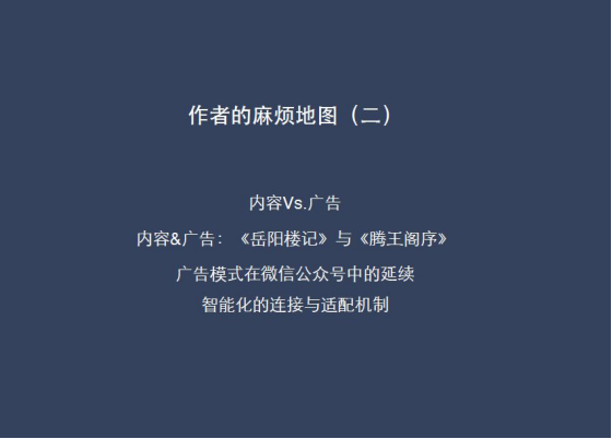 實(shí)際上在內(nèi)容生產(chǎn)的領(lǐng)域,我們是可以找到一個(gè)可以迎合二者鴻溝的方法,只不過(guò)這個(gè)方法過(guò)去我們一直找不到,但現(xiàn)在就可以找到。事實(shí)上在過(guò)去的很多內(nèi)容創(chuàng)作里,我們也能看到某些內(nèi)容本身就是廣告,廣告本身也是內(nèi)容,盡管創(chuàng)造內(nèi)容的時(shí)候,他并沒(méi)有想到去做一個(gè)廣告,但是達(dá)到的廣告效果往往比一個(gè)刻意制造的廣告的效果好幾百、幾萬(wàn)倍。比方說(shuō),江蘇省旅游局沒(méi)有給過(guò)范仲淹稿費(fèi),但沒(méi)如果有這岳陽(yáng)樓記,可能岳陽(yáng)的地方旅游業(yè)根本就開(kāi)展不起來(lái)。