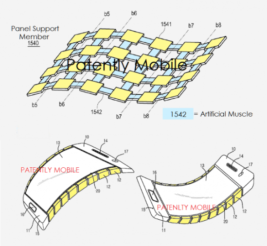 在專(zhuān)利描述中在第一層電極層上附上介電彈性膜,第二層電極層設(shè)置在第一層和將柔性顯示面板的中間,在施加電壓之后就能將兩層進(jìn)行合并,從而在不用手的情況下彎曲柔性屏幕設(shè)備。