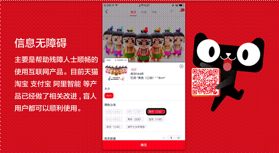 為此,天貓技術團隊專門成立了信息無障礙公益小組,為改善視障用戶實用淘寶、天貓的體驗而努力。最終,他們通過技術將屏幕上的所有圖文信息即時轉(zhuǎn)換為語音信息,從而讓盲人朋友能夠順暢地進行網(wǎng)上購物。