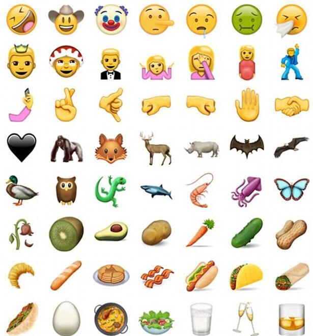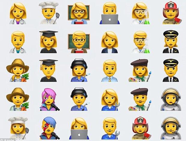 這一系列表情由統(tǒng)一碼聯(lián)盟于今年6月份更新,作為Unicode 9.0更新的一部分。72款最新表情中,包含“交叉手指”、“捂臉”“牛油果”“小丑”等表情。除此之外,還包括一系列動物,如大猩猩、狐貍、鴨子、魷魚等。其中,最大的變化在于包括了可以選擇性別的各類職業(yè),如宇航員、消防員、焊接工,甚至搖滾明星。