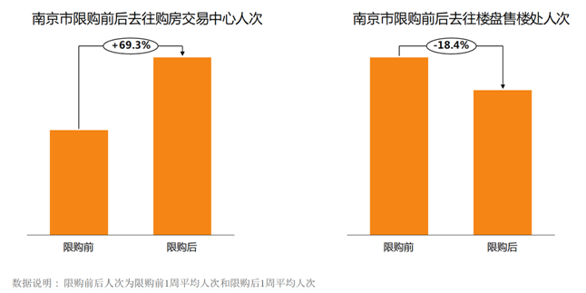 北京9月30日限購政策出臺后,去往購房交易中心人次下降約44%,去往樓盤售樓處的人次上升約2%,購房熱度大幅下降,看房人數(shù)無太多增長,由此可看出限購令下北京人對于買房子更加謹(jǐn)慎了。而南京完全相反,9月26日限購政策出臺后,去往購房交易中心人次上升約70%,去往樓盤售樓處的人次下降約18%,南京樓市在限購令下更加火爆,看房人次變少,而成交率大幅上升,買房更加果斷了。限購令對深圳市整體影響不大,政策出臺前后,去往購房交易中心人次上升僅1.4%,去往樓盤售樓處的人次上升僅1.1%。