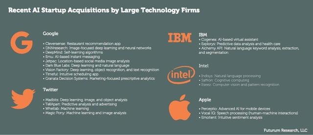近年來,谷歌已經(jīng)并購了11家不同的AI公司,部分源自這些投資的技術(shù)已經(jīng)被用于幫助改善谷歌的搜索功能。我們還看到其推出了Google Assistant,即有機(jī)器學(xué)習(xí)技術(shù)支持的虛擬助理,可在智能手機(jī)Google Pixel和其他配置有谷歌搜索的設(shè)備上為用戶提供易于使用、語音控制的幫助。2014年,谷歌斥資4億美元收購了DeepMind,這是迄今為止數(shù)額最高的AI收購交易。谷歌團(tuán)隊(duì)已經(jīng)將DeepMind的技術(shù)推向極限,其最新機(jī)器學(xué)習(xí)系統(tǒng)TensorFlow很快將向公眾免費(fèi)發(fā)布。在圖片和語音識別、翻譯領(lǐng)域,TensorFlow可模仿人類大腦行為,這使其成為世界上最強(qiáng)大的AI系統(tǒng)之一。