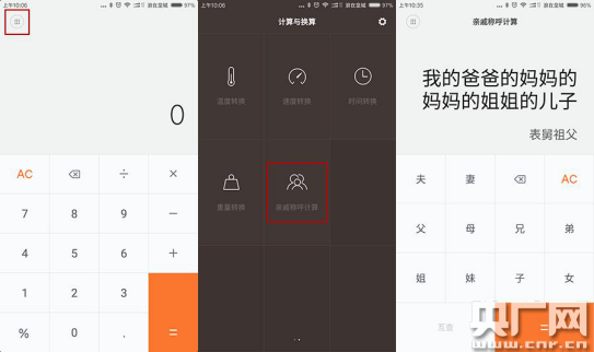 升級到最新版本的MIUI系統(tǒng),系統(tǒng)內(nèi)置計算機(jī)應(yīng)用即配備“親戚稱呼計算”功能,在默認(rèn)界面下點擊左上角菜單欄,右滑第二屏即可看到。
