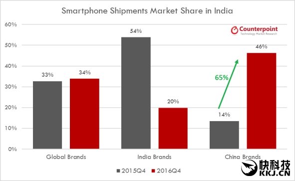 根據(jù)市場研究機構(gòu)Counterpoint Research公布的最新數(shù)據(jù),2016年第四季度,中國手機品牌已經(jīng)占據(jù)印度手機市場的“半壁江山”,出貨量份額達(dá)到46%。