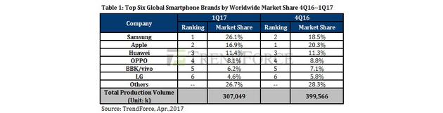 雖然蘋(píng)果公司本身所占市場(chǎng)份額從2016年第四季度的20.3%大幅下降至16.9%,但Trendforce指出紅色版iPhone幫助縮減了降幅:“蘋(píng)果在第一季度發(fā)布了紅色版iPhone 7和iPhone 7 Plus,這種版本被視為去年深黑版的跟進(jìn)產(chǎn)品。消費(fèi)者對(duì)這個(gè)版本的反響良好,幫助蘋(píng)果公司攫取了市場(chǎng)份額。”