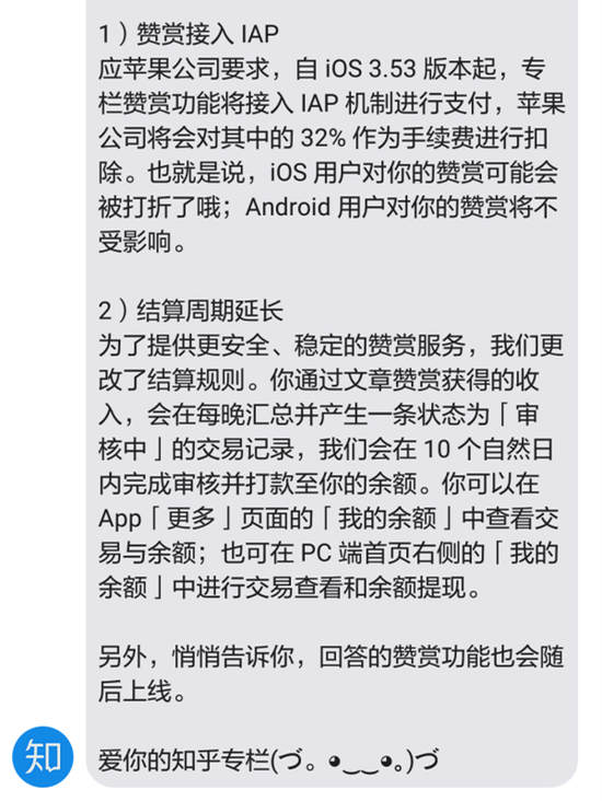 國內(nèi)問答平臺(tái)知乎旗下賬號(hào)知乎專欄發(fā)布公告稱,應(yīng)蘋果公司的要求,從iOS3.5.3版本的知乎APP更新之后,專欄打賞功能將介入IAP付費(fèi)機(jī)制。也就是說,從現(xiàn)在版本開始,蘋果會(huì)對(duì)打賞金額的32%當(dāng)成手續(xù)費(fèi)進(jìn)行扣除,用戶只能獲得剩下的68%的打賞分成。知乎同時(shí)表示,安卓手機(jī)用戶不受影響。