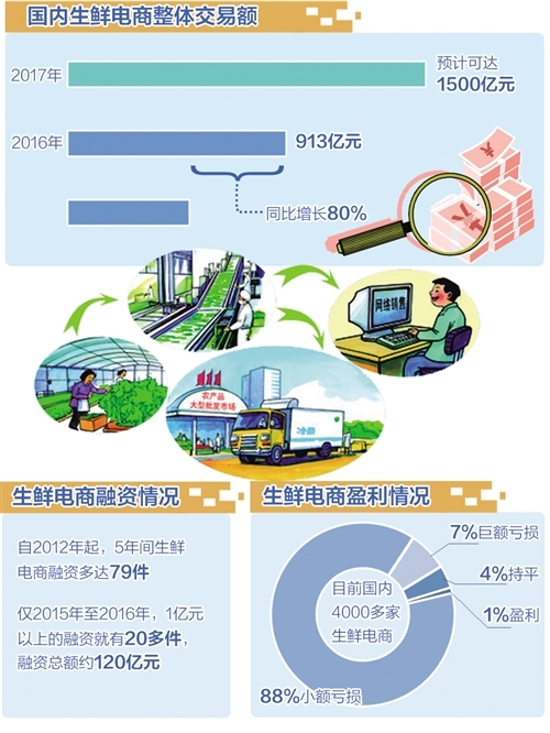 在消費升級、移動互聯(lián)網(wǎng)發(fā)展及供給側(cè)結(jié)構(gòu)性改革的共同作用下,生鮮電商被各路資本視為有利可圖的一塊大蛋糕。但由于成本居高不下、配套冷鏈物流體系不健全,4000多家生鮮電商僅1%盈利,多數(shù)企業(yè)難以通過持續(xù)“燒錢”走到終點。未來,生鮮電商線上、線下、物流三者必須緊密結(jié)合,加快探索新零售模式,才能真正增加用戶黏性,形成以高頻和復(fù)購為核心的用戶群,促進生鮮消費——