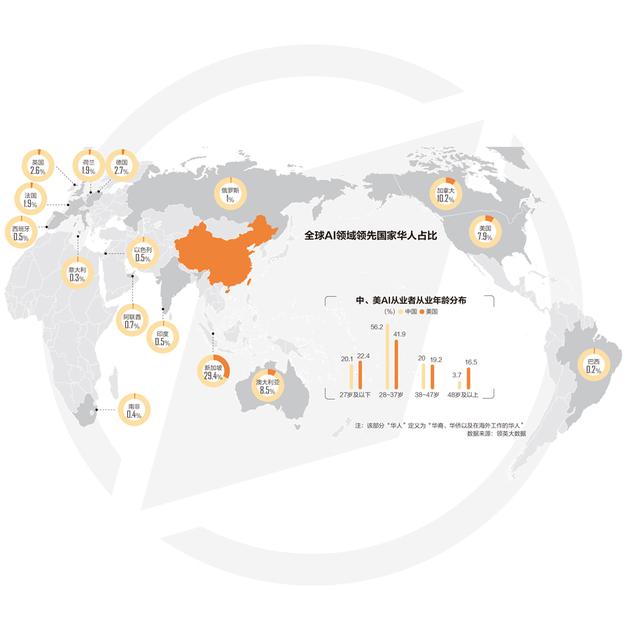 根據(jù)領(lǐng)英發(fā)布的《全球AI領(lǐng)域人才報(bào)告》,全球的華人AI技術(shù)人才占全球AI技術(shù)人才總數(shù)的6.5%左右,華人技術(shù)人才占比最高的是新加坡(29.4%)、加拿大(10.2%)、澳大利亞(8.5%)、美國(guó)(7.9%)和德國(guó)(2.7%)。