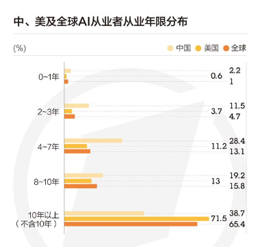 從競(jìng)爭(zhēng)的角度來看,人才結(jié)構(gòu)還存在顯著差異。中國(guó)信息技術(shù)行業(yè)擁有十年以上工作經(jīng)驗(yàn)的人才只占15%左右,而美國(guó)以超過70%的超高比例領(lǐng)先于世界平均水平。