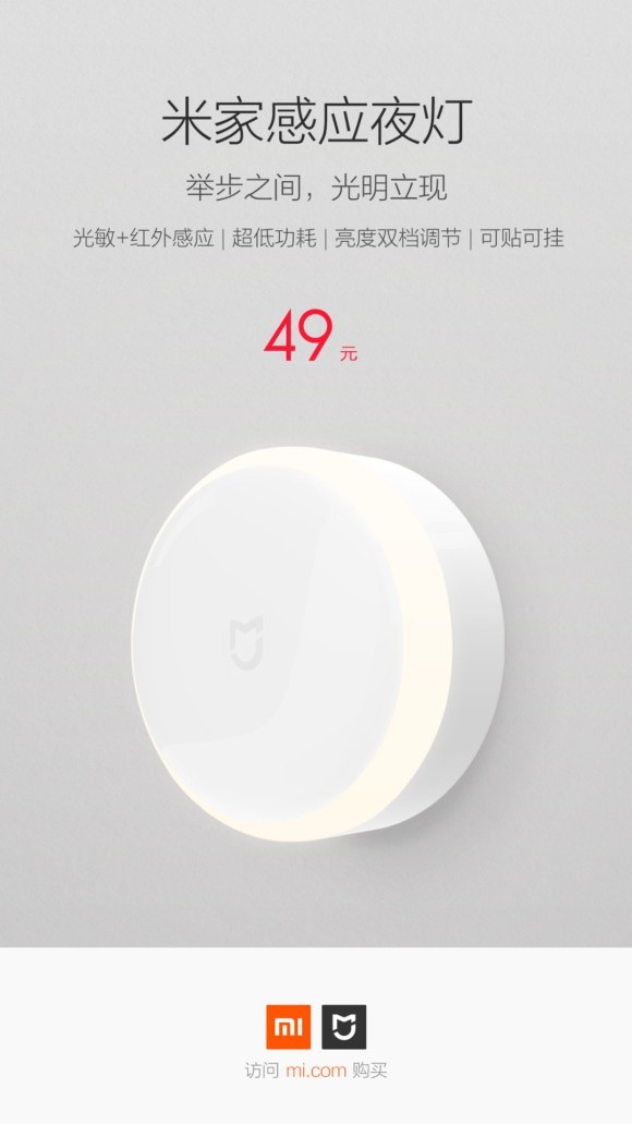 市售小夜燈種類頗多,有些受供電方式的束縛,不能隨心所欲放在需要照明的位置,而有些雖然可粘貼擺放,卻又受傳感器精度差的影響,經(jīng)常誤亮或者不亮,再加上很多低價(jià)產(chǎn)品做工粗糙、燈光刺眼、有眩光,總是影響消費(fèi)者的體驗(yàn)。而米家感應(yīng)夜燈不僅做工精細(xì)、感應(yīng)穩(wěn)定,而且省電節(jié)能、光源舒適,售價(jià)僅為49元更是極具性價(jià)比,感興趣的用戶可以在7月18日上午10點(diǎn)在小米商城、米家有品、天貓小米旗艦店、京東、蘇寧以及小米之家購買。