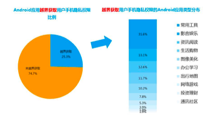 用戶更需警惕的是,25.3%的android應用存在越界獲取用戶手機隱私權(quán)限的情況。