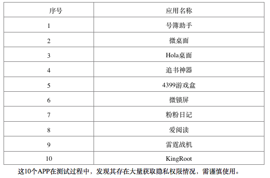 報告還給出了一份包括 10個應用的隱私安全灰名單,分別是號簿助手、微桌面、Hola桌面、追書神器、4399游戲盒、微鎖屏、粉粉日記、愛閱讀、雷霆戰(zhàn)機、KingRoot。