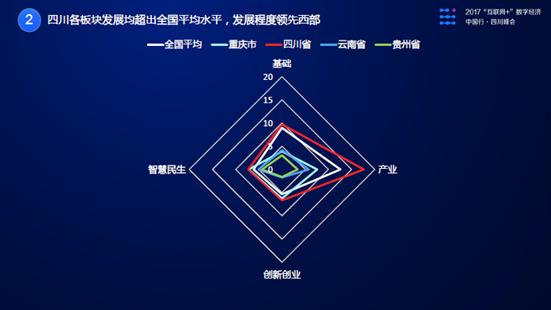 四川省的互聯(lián)網(wǎng)+數(shù)字經(jīng)濟基礎(chǔ)指數(shù)、產(chǎn)業(yè)指數(shù)、創(chuàng)新創(chuàng)業(yè)指數(shù)、智慧民生指數(shù)均取得了長足、均衡發(fā)展。四大板塊的發(fā)展均超出全國平均水平,并領(lǐng)先于重慶、云南、貴州。特別是產(chǎn)業(yè)指數(shù),領(lǐng)先優(yōu)勢尤為明顯。