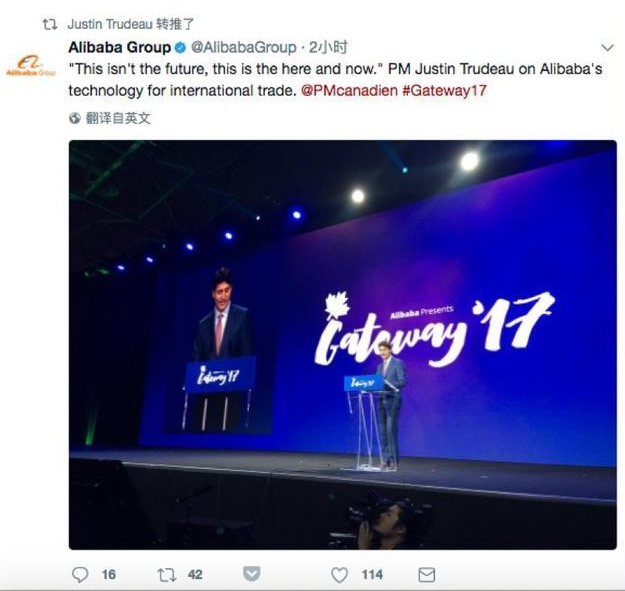 演講結(jié)束,特魯多就轉(zhuǎn)載了阿里巴巴的推文,并這樣評(píng)價(jià)阿里巴巴的技術(shù)對(duì)國際貿(mào)易的作用:“這不是未來,這就是此時(shí)此地正在發(fā)生的!