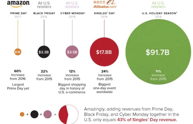 (圖片左四位為2016年天貓雙11銷售額,超過(guò)美國(guó)所有節(jié)日促銷的總額)