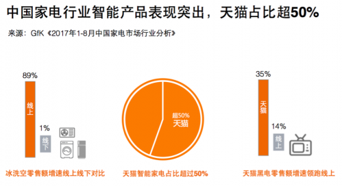 據(jù)GfK全國(guó)零售監(jiān)測(cè)數(shù)據(jù)顯示,2017年1-8月,冰箱、洗衣機(jī)、空調(diào)零售市場(chǎng)零售額同比分別上漲6%、10%、27%,其中智能產(chǎn)品零售額占比超過(guò)32%,天貓智能家電占比高于整體市場(chǎng),超過(guò)50%;彩電市場(chǎng)線上零售額增速14%,其中天貓的黑電零售額增速高于大盤,達(dá)35%,其中60及60吋以上黑電零售額增速183%。