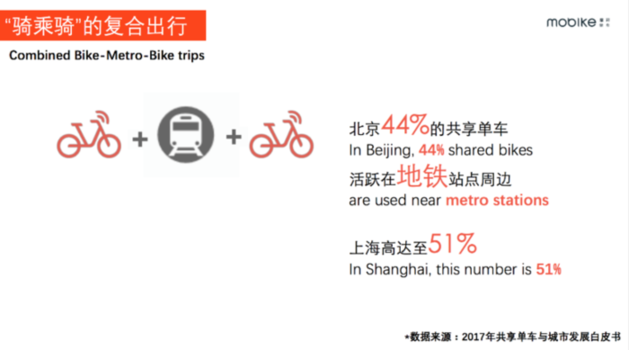 今年4月由清華同衡和摩拜單車聯(lián)合發(fā)布的《2017年共享單車與城市發(fā)展白皮書》顯示,地鐵站附近的騎行率最高,北京有超過(guò)44%的共享單車活躍在地鐵周邊,而上海有超過(guò)51%的共享單車活躍在地鐵周邊。騎-乘-騎成最受歡迎的綠色出行方式。此外,85%的居民從地鐵站出發(fā),騎行距離超過(guò)3公里。共享單車成為TOD規(guī)劃中重要的一環(huán),地鐵站周邊應(yīng)建立充足便利的自行車停放點(diǎn)。