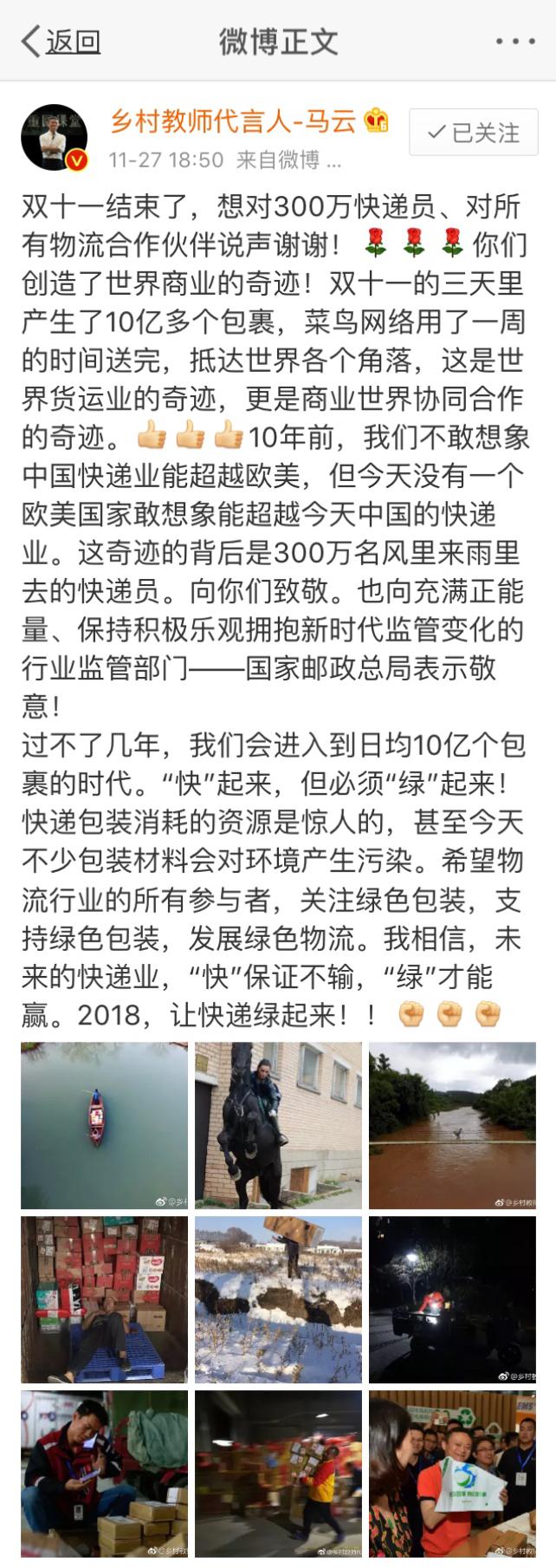 “未來的快遞業(yè),‘快’保證不輸,‘綠’才能贏。2018,讓快遞綠起來!”馬云在微博中說。