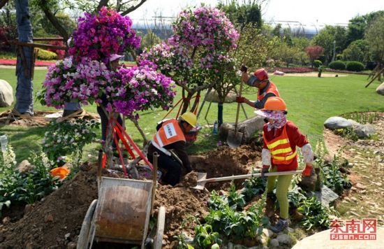 福州園林工人在海峽國際會展中心周邊種植三角梅等花卉!∪~義斌 攝