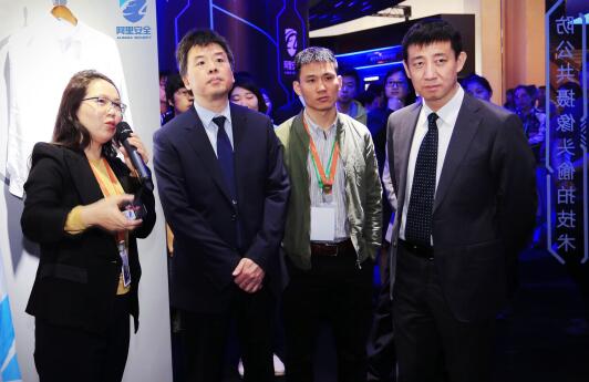阿里巴巴集團(tuán)首席風(fēng)險(xiǎn)官鄭俊芳(左一)在北京展覽館阿里展區(qū)向公安部網(wǎng)絡(luò)安全保衛(wèi)局副局長(zhǎng)鐘忠(左二)、北京市公安局副局長(zhǎng)張。ㄓ乙唬┙榻B阿里安全八大實(shí)驗(yàn)室的核心技術(shù)能力