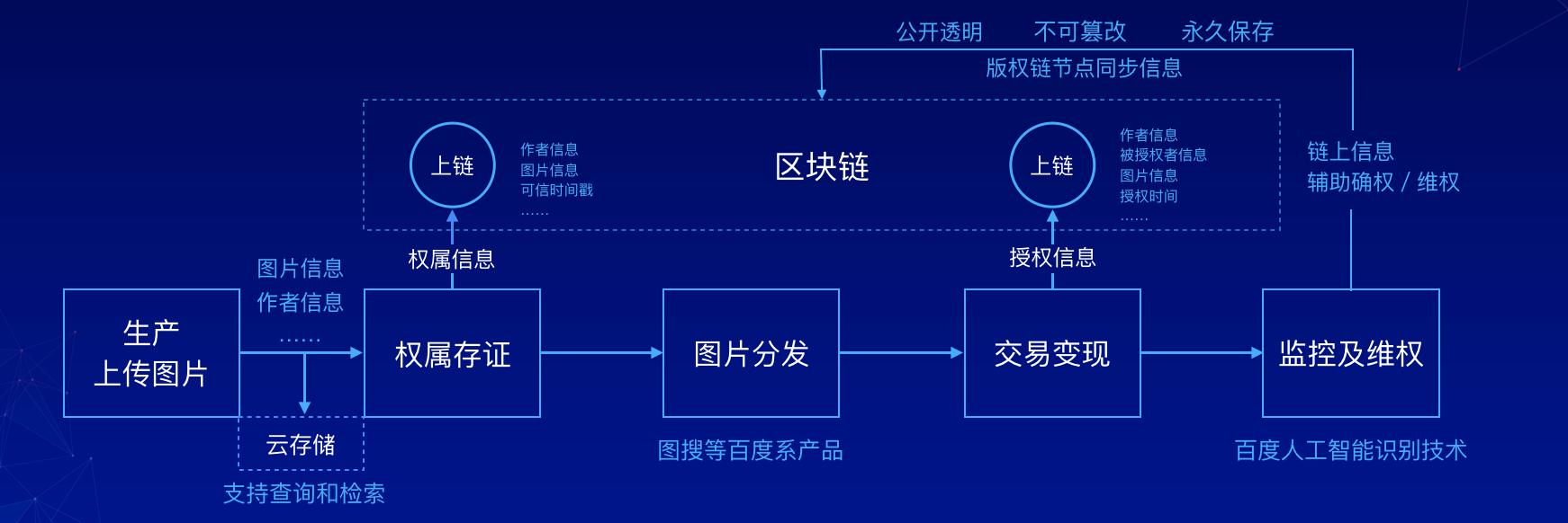 百度圖騰通過引入?yún)^(qū)塊鏈技術(shù),并借助百度搜索的平臺(tái)力量以及第三方合作伙伴,構(gòu)建了一個(gè)覆蓋圖片生產(chǎn)、權(quán)屬存證、圖片分發(fā)、交易變現(xiàn)、侵權(quán)監(jiān)測、維權(quán)服務(wù)的全鏈路版權(quán)服務(wù)平臺(tái)。