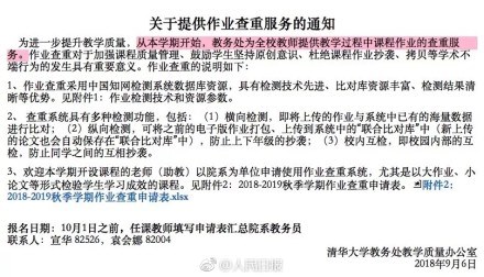 隨著各大高校紛紛迎來開學季,一些高校的教務系統(tǒng)也填了新“設備”。近日,記者從清華大學官網(wǎng)了解到,從今年秋季學期開始,清華大學將為全校教師提供教學過程中課程作業(yè)的查重服務,系全國首個對學生課程作業(yè)查重的高校。