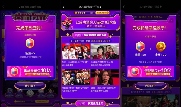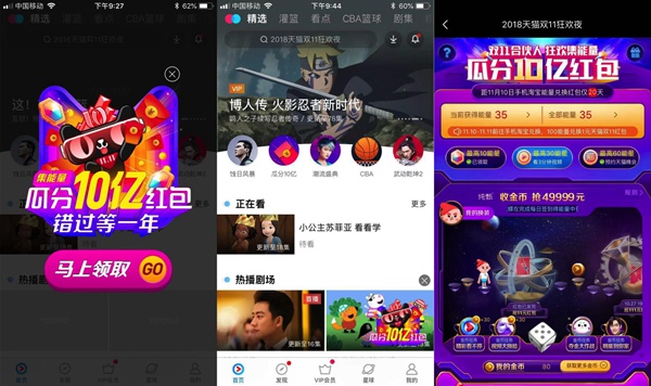 以優(yōu)酷為主的阿里大文娛是阿里經(jīng)濟(jì)體重要的用戶平臺(tái),參戰(zhàn)雙11與天貓形成深度協(xié)同。在“雙11合伙人”計(jì)劃中,打開優(yōu)酷進(jìn)入“2018天貓雙11狂歡夜”主會(huì)場(chǎng),參與游戲活動(dòng)即可持續(xù)積累多種福利。