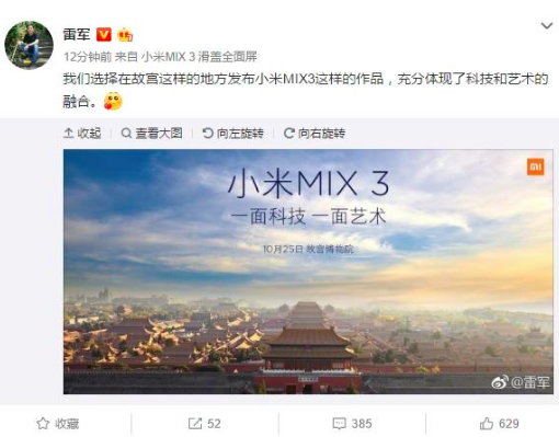 10月23日,小米官方宣布MIX 3將于10月25日在故宮博物院發(fā)布。小米科技CEO雷軍表示,我們選擇在故宮這樣的地方發(fā)布小米MIX3這樣的作品,充分體現(xiàn)了科技和藝術(shù)的融合。