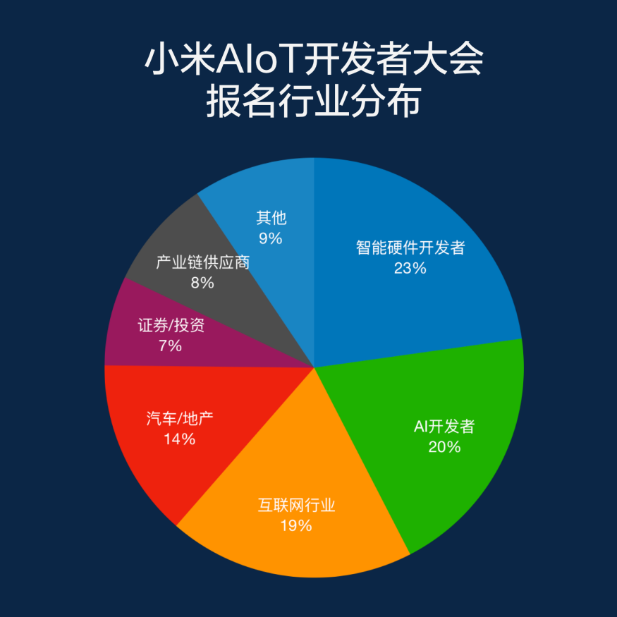 值得注意的是,投資、證券、汽車(chē)、地產(chǎn)等行業(yè),在本次報(bào)名人數(shù)占了相當(dāng)大的比重,其中汽車(chē)和地產(chǎn)行業(yè)報(bào)名人數(shù)占14%,證券投資報(bào)名人數(shù)占了7%,這表明小米AIoT大會(huì)的影響力已跨出技術(shù)圈,產(chǎn)生了廣泛的社會(huì)影響,AI+IoT的時(shí)代正在來(lái)臨。