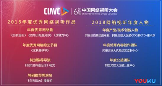 11月29日,在成都舉行的第六屆中國網(wǎng)絡(luò)視聽大會上,《白夜追兇》《這就是鐵甲》《假如沒有遇見你》等優(yōu)酷原創(chuàng)劇綜斬獲年度優(yōu)秀網(wǎng)絡(luò)劇、年度優(yōu)秀網(wǎng)絡(luò)綜藝節(jié)目等六個(gè)內(nèi)容品類大獎,阿里巴巴集團(tuán)副總裁、阿里文娛大優(yōu)酷COO兼CTO莊卓然以及優(yōu)酷綜藝監(jiān)制中心等優(yōu)酷個(gè)人和團(tuán)隊(duì)獲年度產(chǎn)品/技術(shù)創(chuàng)新人物、年度優(yōu)酷內(nèi)容創(chuàng)作團(tuán)隊(duì)以及年度公益團(tuán)隊(duì)三項(xiàng)大獎。