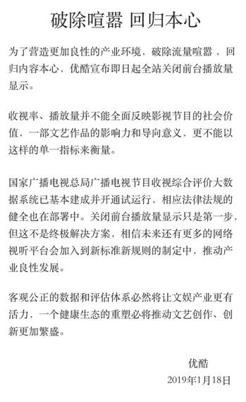 “收視率、播放量并不能全面反映影視節(jié)目的社會(huì)價(jià)值,一部文藝作品的影響力和導(dǎo)向意義,更不能以這樣一個(gè)簡(jiǎn)單的指標(biāo)來(lái)衡量!蓖瑫r(shí)優(yōu)酷也表示,關(guān)閉前臺(tái)播放量顯示只是第一步,但這不是終極解決方案,相信未來(lái)還有更多的網(wǎng)絡(luò)視聽平臺(tái)會(huì)加入到新標(biāo)準(zhǔn)新規(guī)則的制定中,推動(dòng)產(chǎn)業(yè)良性發(fā)展。