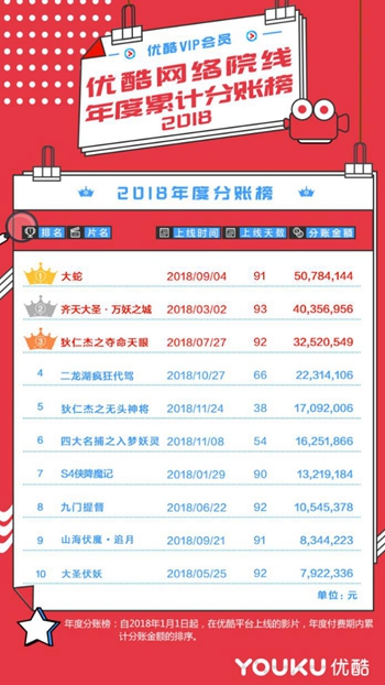 1月21日,優(yōu)酷發(fā)布網(wǎng)絡院線年度累計分賬榜,《大蛇》以5078萬分賬成績摘得桂冠,約等同于院線電影1.65億票房,并與《齊天大圣·萬妖之城》成為全行業(yè)年度分賬冠軍和季軍。優(yōu)酷全年產(chǎn)生8部影片分賬超過1000萬。在2018影視寒冬的大環(huán)境下,網(wǎng)絡電影頭部項目喜人的分賬成績,無疑給這個冬天增加了一抹暖色。