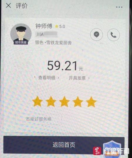 紅星新聞記者從乘客提供的行程界面發(fā)現(xiàn),鐘師傅是個五星好評司機。