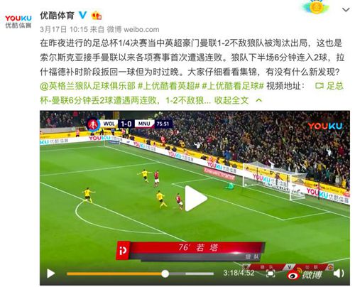 2比1力斬“紅魔”曼聯(lián),昂首殺進(jìn)英格蘭足總杯四強(qiáng),3月17日凌晨,英超狼隊(duì)再次扳倒豪門(mén)。與此同時(shí),優(yōu)酷體育正式宣布與狼隊(duì)達(dá)成合作,成為球隊(duì)中國(guó)區(qū)獨(dú)家新媒體合作伙伴,比賽場(chǎng)邊的廣告板上已用最直觀的方式傳達(dá)出這個(gè)信息。