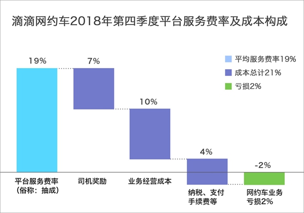 在滴滴平臺(tái)上,受不同城市、訂單距離長短、時(shí)間長短、拼車與否等因素影響,每筆訂單會(huì)收取不同比例的平臺(tái)服務(wù)費(fèi)(即大家俗稱的抽成)。比如2018年第4季度,滴滴國內(nèi)收取的平均平臺(tái)服務(wù)費(fèi)率約為乘客實(shí)際支付車費(fèi)的19%。其中乘客支付的遠(yuǎn)程調(diào)度費(fèi)、動(dòng)態(tài)調(diào)價(jià)、感謝紅包等幾類費(fèi)用是全額給到司機(jī)的,平臺(tái)不收費(fèi)。