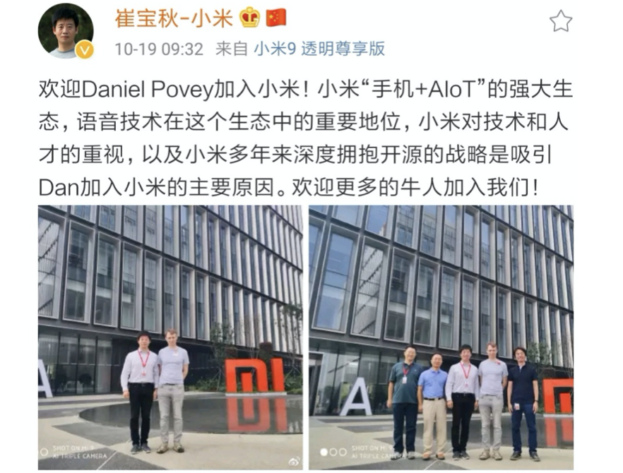 央廣網(wǎng)科技10月19日消息 今天,小米集團(tuán)副總裁、集團(tuán)技術(shù)委員會主席崔寶秋博士在社交媒體上宣布,國際語音識別和AI領(lǐng)域的天才教授、語音識別開源工具Kaldi之父 Daniel Povey正式加入小米。