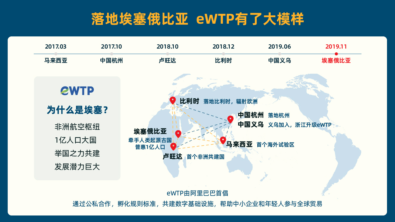 根據(jù)協(xié)議,阿里巴巴與埃塞俄比亞將圍繞eWTP全面合作。阿里巴巴還攜手義烏,與埃塞打造多功能數(shù)字貿(mào)易樞紐(eHub),這里將成為非洲商品出口全球的門戶。