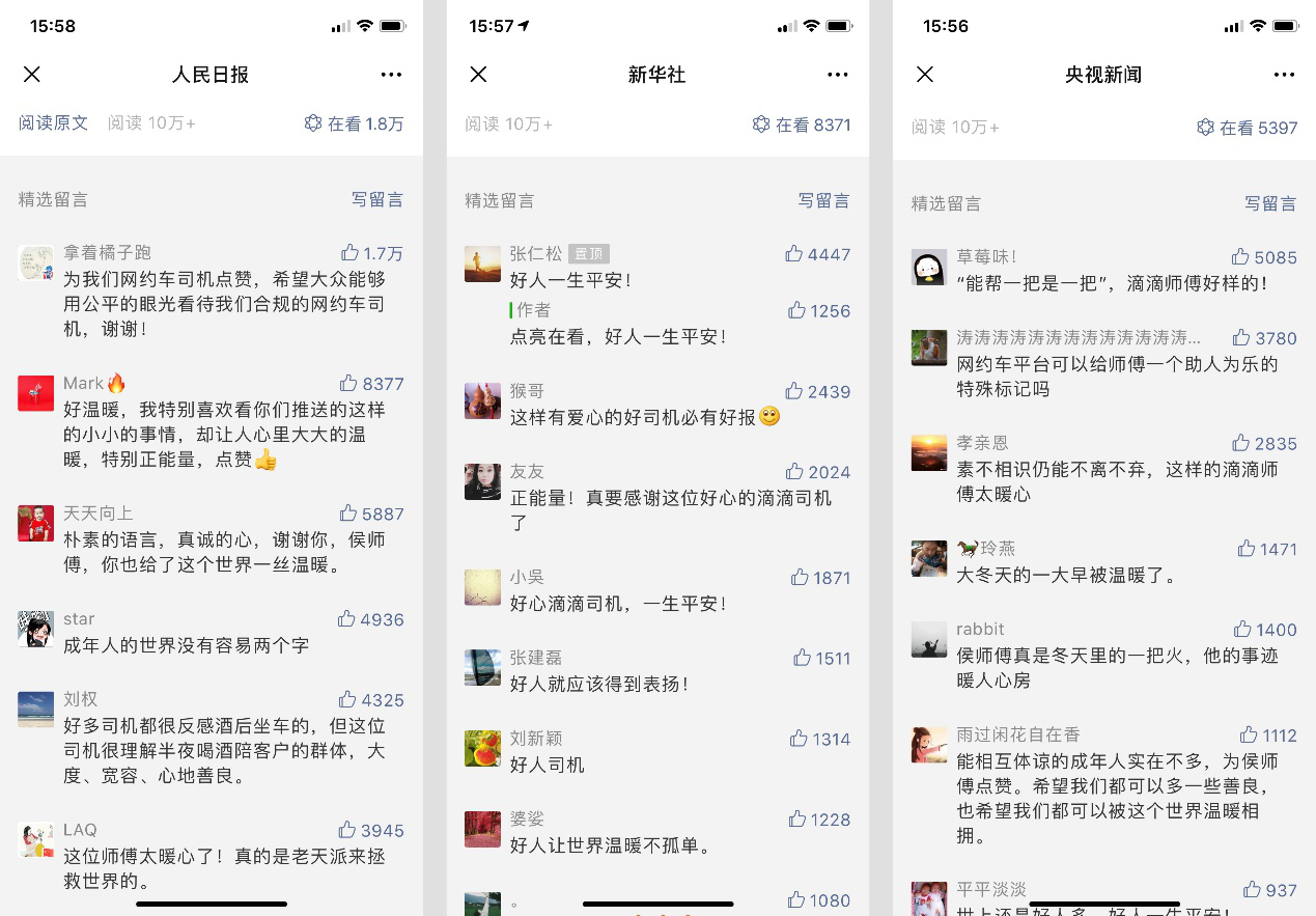 人民日?qǐng)?bào)、新華社、央視新聞官方微信評(píng)論截圖