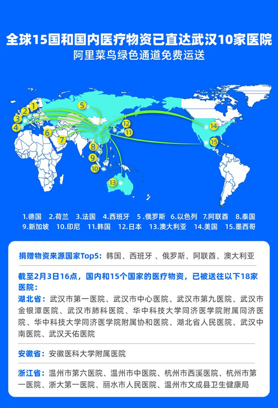 1月25日,阿里巴巴設(shè)立10億元醫(yī)療物資供給專(zhuān)項(xiàng)基金,雙管齊下:將集團(tuán)在海內(nèi)外采購(gòu),和海內(nèi)外企業(yè)、團(tuán)體和個(gè)人捐贈(zèng)的大量醫(yī)療物資,通過(guò)阿里公益及菜鳥(niǎo)綠色通道直送國(guó)內(nèi)疫區(qū)醫(yī)院。