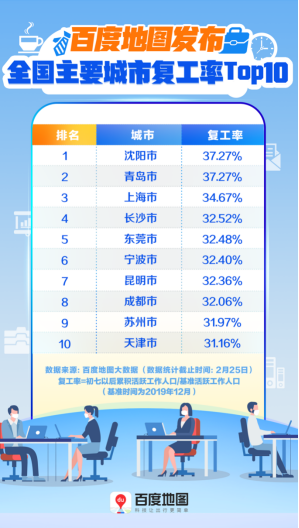 隨著疫情防控向好發(fā)展,“暫!绷艘粋(gè)月的全國(guó)各地終于按下復(fù)工“播放鍵”。近日,百度地圖發(fā)布復(fù)工指數(shù),通過百度地圖大數(shù)據(jù)聚焦全國(guó)主要城市復(fù)工率Top10。數(shù)據(jù)顯示,截至2月25日,各城市復(fù)工人數(shù)均不及疫情前四成,沈陽(yáng)、青島、上海最先“忙碌”起來(lái),杭州、長(zhǎng)沙、成都等新一線城市表現(xiàn)積極,因受疫情影響,武漢市復(fù)工指數(shù)僅為12%。