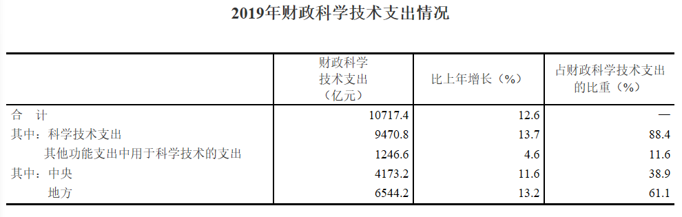 2019年,國家財政科學(xué)技術(shù)支出10717.4億元,比上年增加1199.2億元,增長12.6%。其中,中央財政科學(xué)技術(shù)支出4173.2億元,增長11.6%,占財政科學(xué)技術(shù)支出的比重為38.9%;地方財政科學(xué)技術(shù)支出6544.2億元,增長13.2%,占比為61.1%。