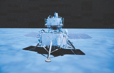 在北京航天飛行控制中心拍攝的落月后的嫦娥五號(hào)探測(cè)器模擬圖。